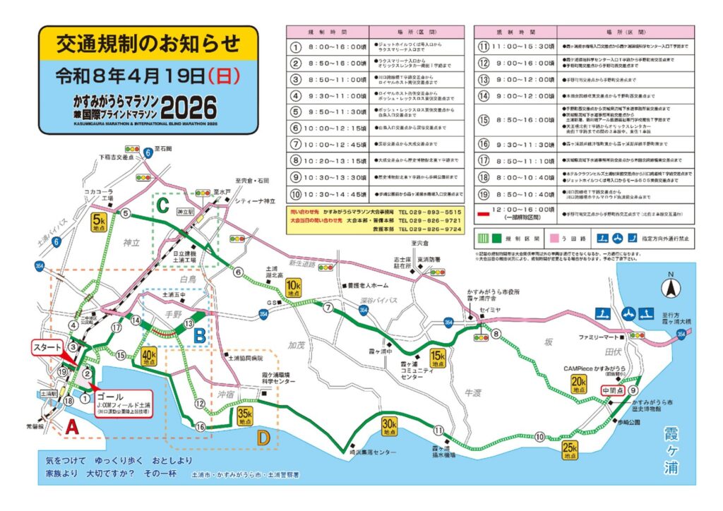 2026年4月19日(日)「かすみがうらマラソン兼国際ブラインドマラソン」が開催されます。開催に伴いまして、8:00より、下記の通り順次交通規制となります。ご来館されますお客様におかれましては大変ご迷惑をお掛け致しますが、事前の道路交通状況のご確認をお願い申し上げます。
